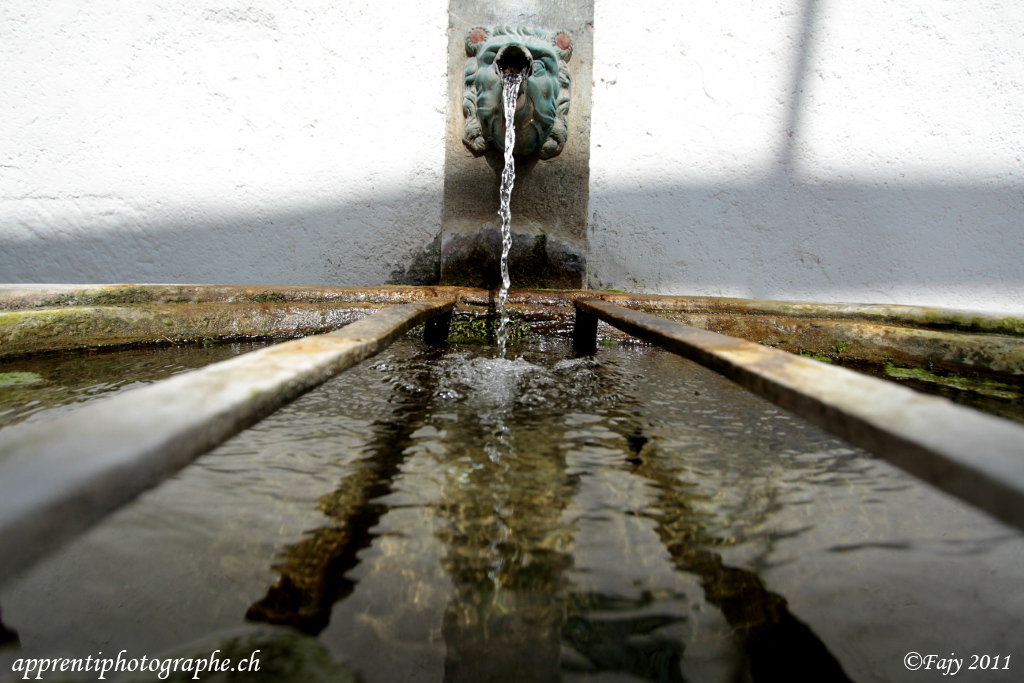 Un autre exemple plus flagrant où, grâce aux barres de soutien, le regard est conduit vers la tête de la fontaine et le filet d’eau qui en sort.