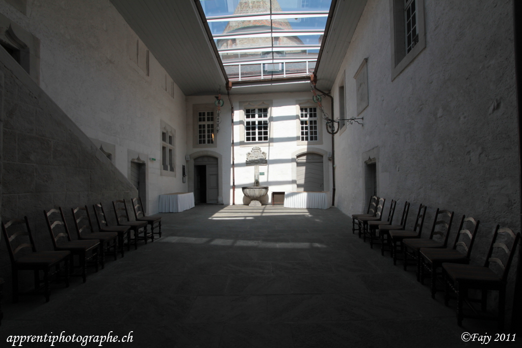 En s’aidant des chaises alignées le long des murs, l’oeil est naturellement guidé vers la fontaine.