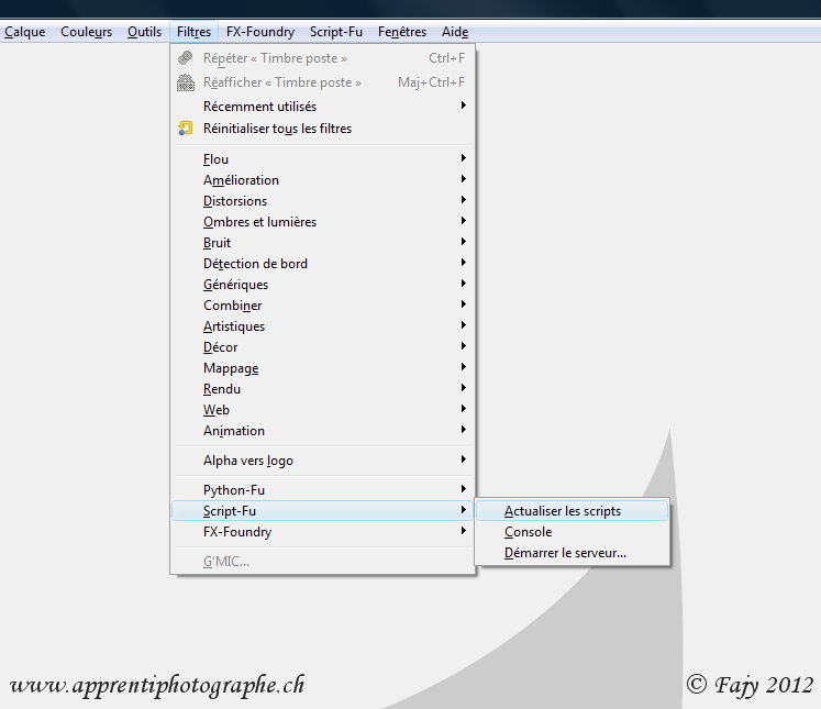 Il est ensuite nécessaire de réactualiser les scripts dans Gimp :