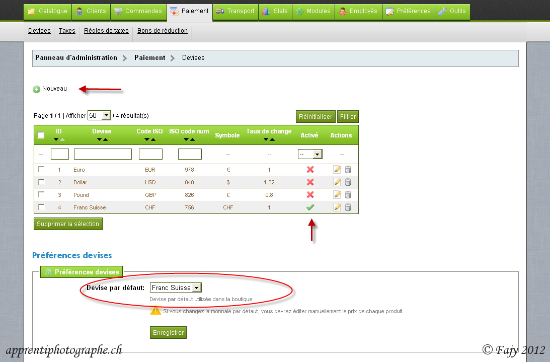 De base, le CMS Prestashop est déjà configuré avec trois monnaies principales : l’Euro, le Dollars et la Livre Sterling. Pour les autres monnaies utilisées par exemple par nous les Suisses, il est nécessaire de les définir manuellement.