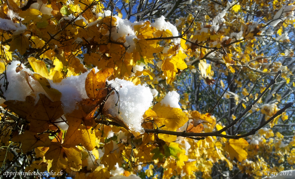 Cette année, la nature a tardé a rentrer dans ses quartiers d’automne permettant à la première neige de saupoudrer de ses cristaux, des feuilles aux couleurs de fin d’été. Elle me permet ainsi de vous offrir une petite galerie de ces clichés féériques.