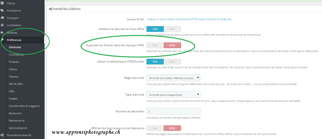 Dans Prestashop il existe une option qui vous permet d’insérer des balises iframes dans les champs textuels, tels que les descriptions de produits. Cette option est désactivée par défaut.