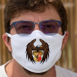 Zweischichtige Schutzmaske aus Stoff mit einem prächtigen Adler, ausgebreiteten Flügeln und einem Wappen in den Farben der Stadt und des Kantons Genf zwischen den Krallen
