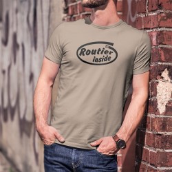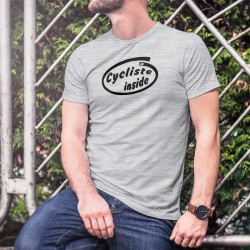 Humorvolles T-Shirt illustriert mit dem Zitat "Biker Inside" (Radfahrer innerhalb des T-Shirt) eine Variation von Intels Slogan