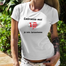 Mode-T-Shirt in einem sehr femininen Schnitt, illustriert mit einem Herz, das das Wappen der Republik und des Kantons Jura darstellt und das Zitat "Embrasse-moi je suis Jurassienne"