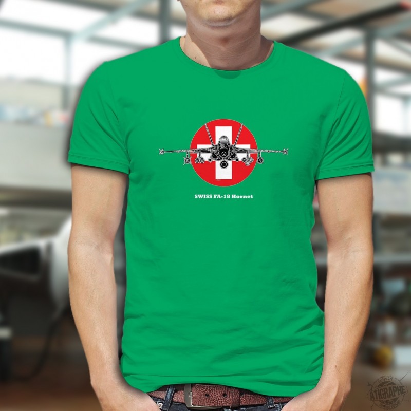 T-Shirt aus 100% Baumwolle mit der Silhouette einer McDonnell Douglas FA-18 Hornet, einem Mehrzweck-Kampfflugzeug und den Waffen der Schweizer Luftwaffe im Hintergrund.