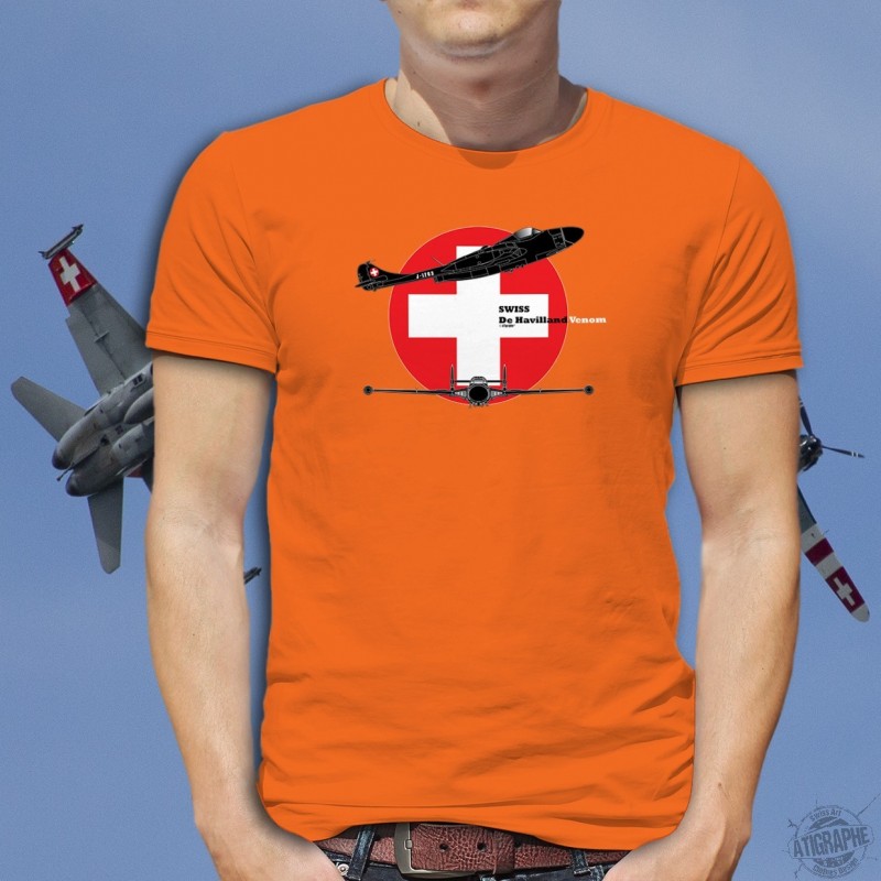 Herren-T-Shirt aus 100% Baumwolle, abgebildet mit dem Jagdflugzeug de Havilland Venom Blueprint Version und der Schweizer Luftwaffe Wappen im Hintergrund