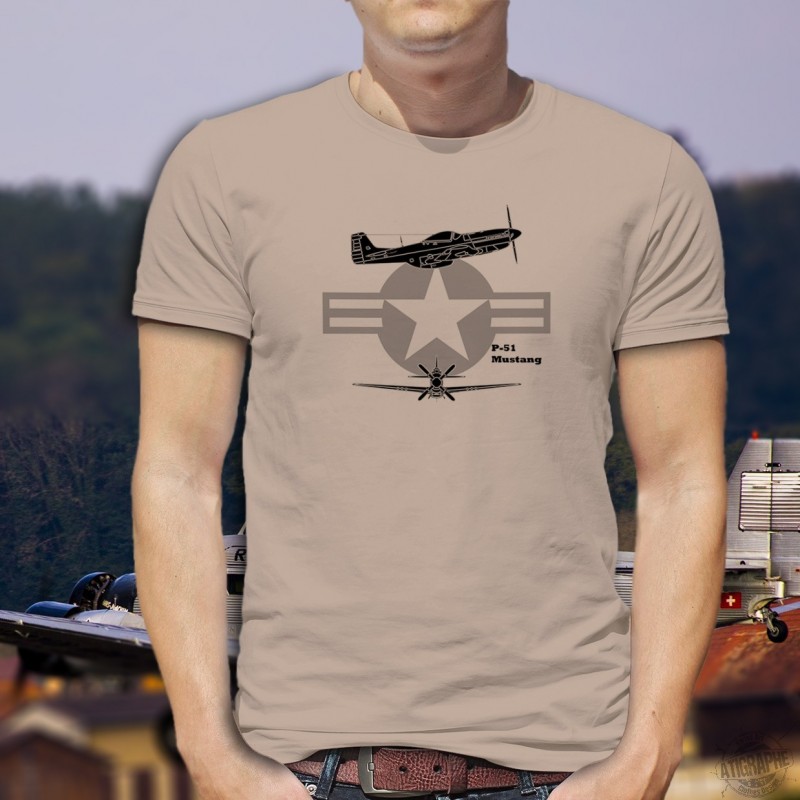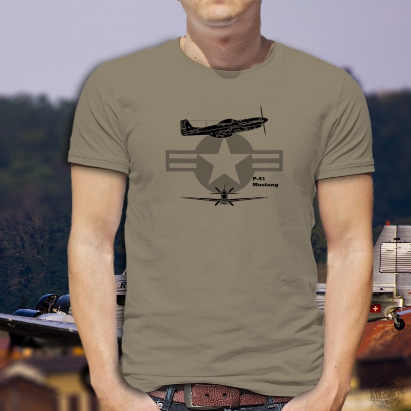 Das mit der Silhouette einer P-51 Mustang illustrierte T-Shirt mit dem USAF-Emblem im Hintergrund ist ein Highlight für Flugzeugfans und Liebhaber der Militärgeschichte.
