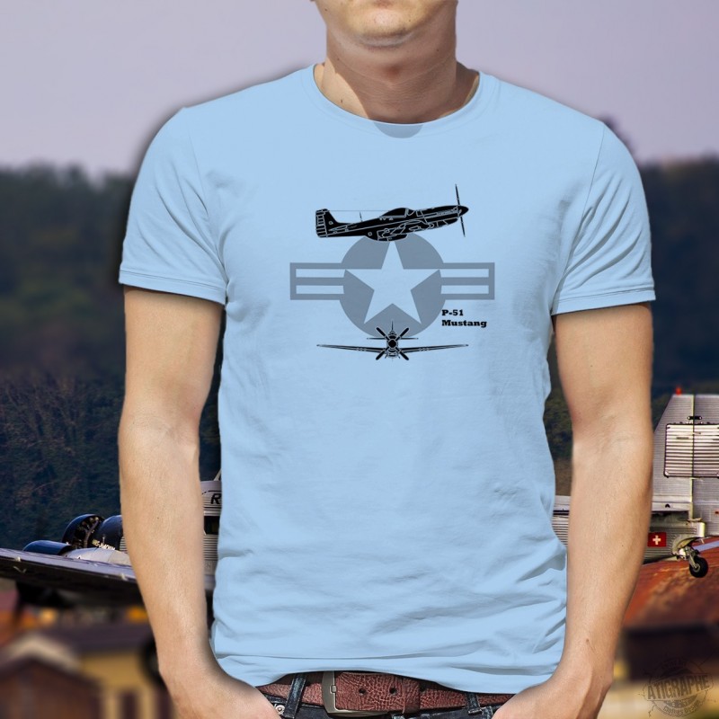 Die Silhouette der P-51 Mustang, eines ikonischen Jagdflugzeugs aus dem Zweiten Weltkrieg, wird auf diesem T-Shirt elegant hervorgehoben.
