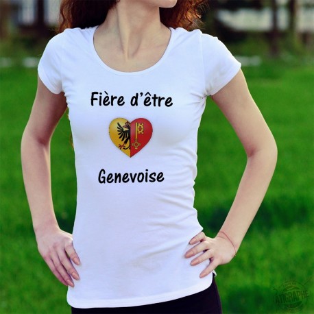Frauen Mode T-shirt mit einem Genfer Herz und der stichwort " Fière d'être Genevoise" illustriert