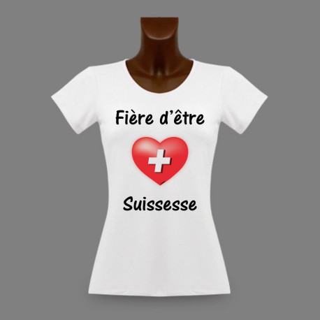 Frauen Slim T-shirt mit einem Schweizer Herz und der stichwort " Fière d'être Suissesse" illustriert