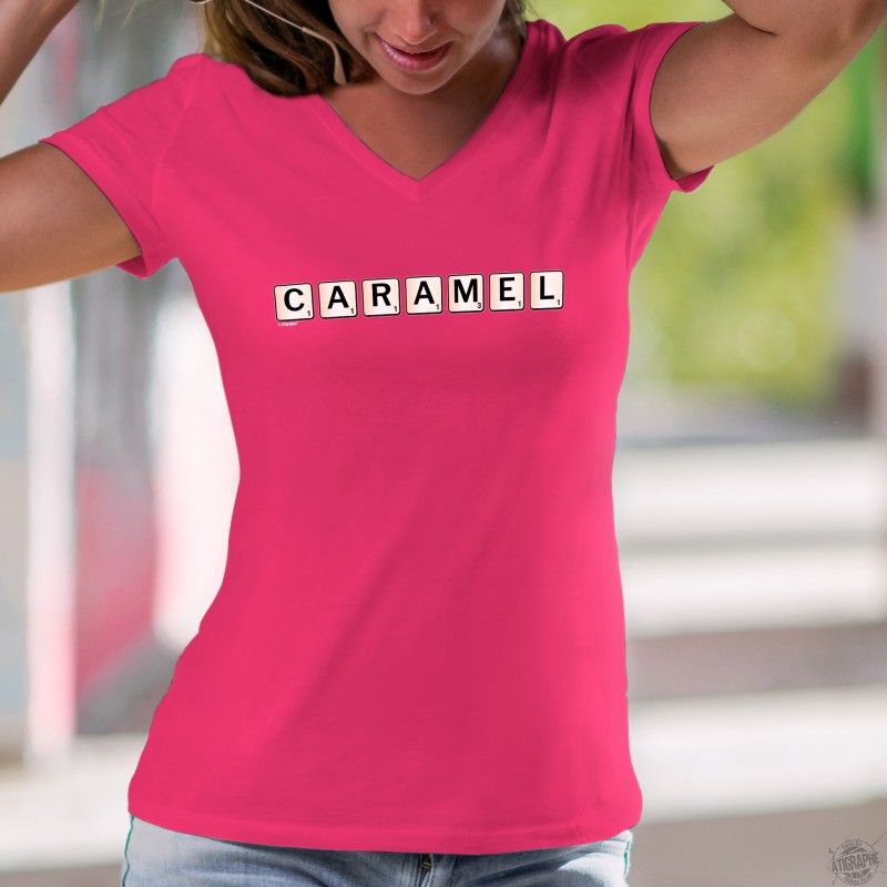 Damen Mode Baumwoll T-Shirt mit dem französischen Zitat "Caramel"