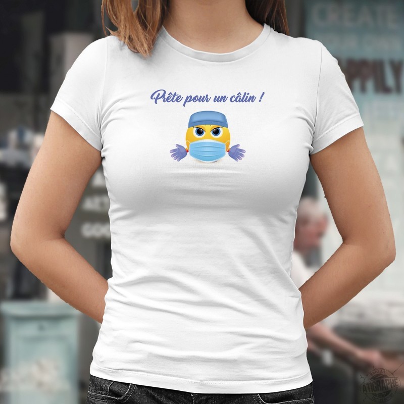 Damenmode T-shirt mit der Zitat "Prête pour un câlin ! ❤ émoticône ❤
