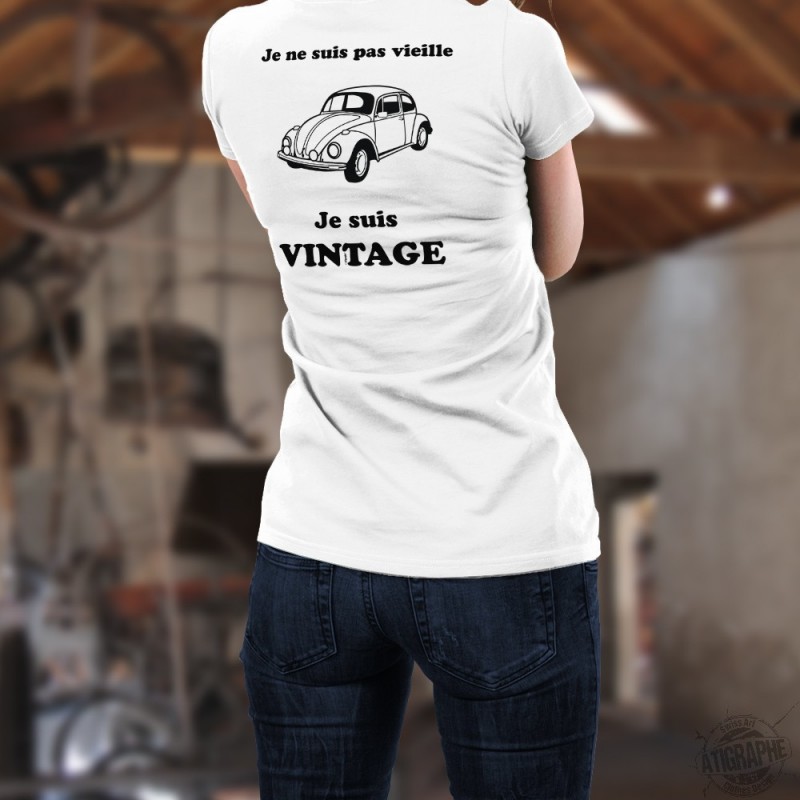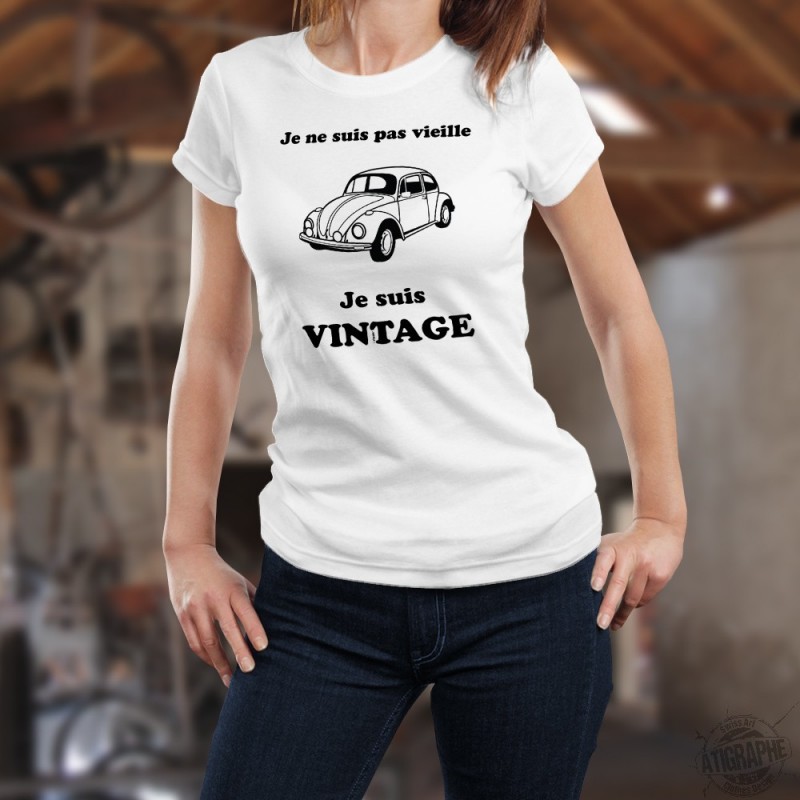 Frauen T-shirt mit einer Vintage VW Käfer und dem humorvollen Zitat "Je ne suis pas vieille, je suis Vintage", französisch Version