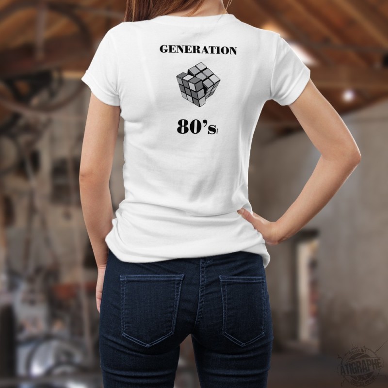 Frauen T-shirt illustriert mit einem Rubik's cube und dem lustigen Zitat "Generation 80's"