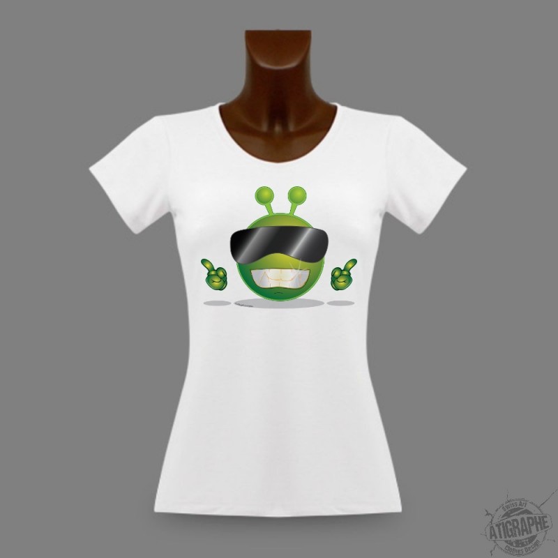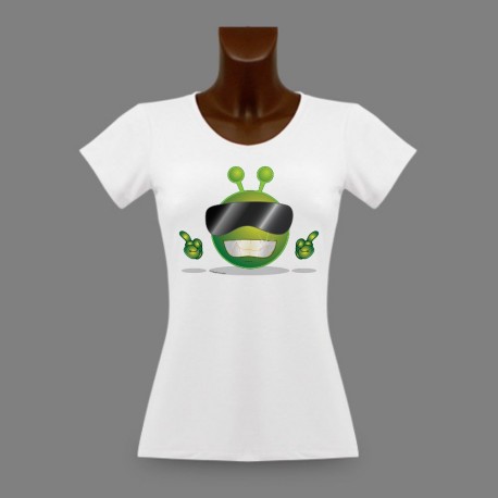 T-Shirt, mit einem entspannten Alien smiley mit Sonnenbrillen illustriert.