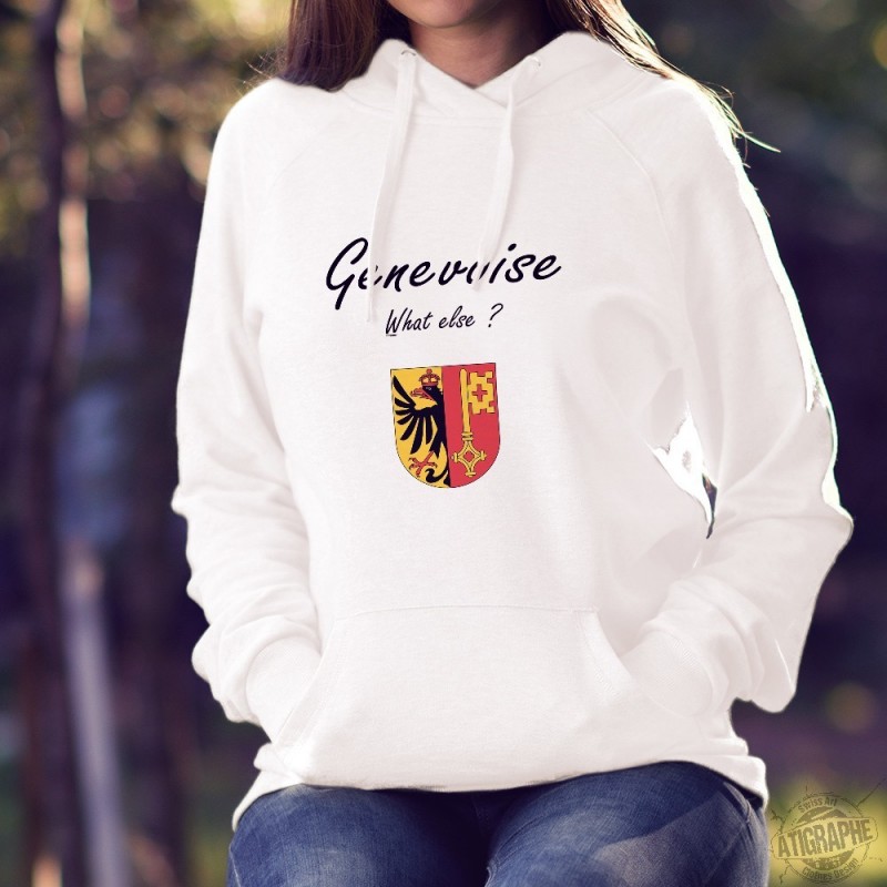 Weißer Kapuzenpullover für Frauen mit dem Wappen des Kantons Genf und der Aufschrift ★ Genevoise, What else ? ★ was noch? ★ inspiriert von der Anzeige für eine Kaffeemarke
