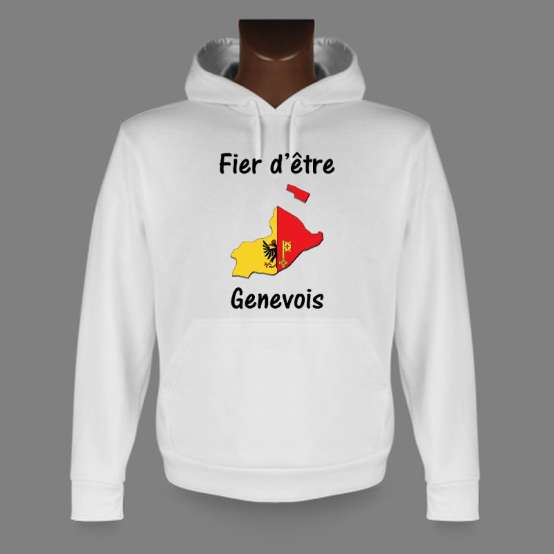 Kapuzen-Sweatshirt für Mann oder Frau, mit der Genfer Fahne und dem Slogan "Fier d'être Genevois" illustriert.