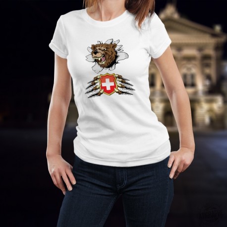 Damenmode-T-Shirt mit dem Kopf eines knurrenden Bären, der das T-Shirt zerreißt und das Wappen der Schweiz zwischen den Krallen hält