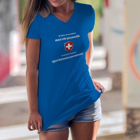 Damen Mode T-Shirt, 100% Baumwolle, illustriert mit ✚ En Suisse on va au bistrot aussi vite que possible ✚