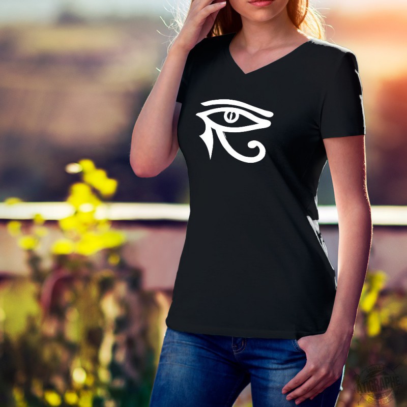 Damen Mode Baumwoll T-Shirt illustriert mit dem Auge Symbol des Falkengottes Horus (Oudjat Symbol des Falkengottes)