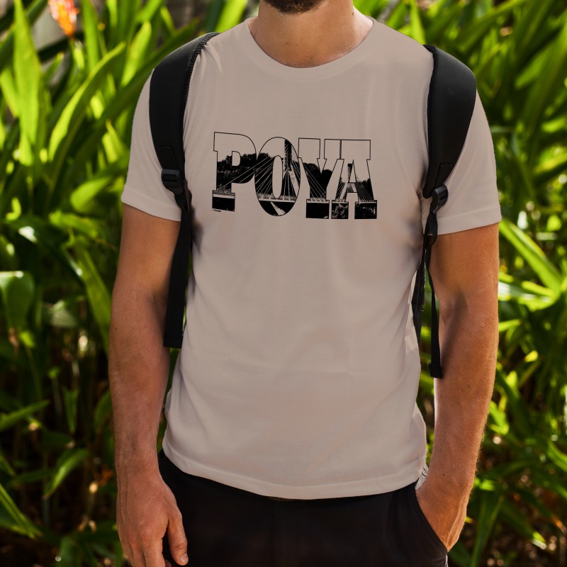 T-Shirt mit dem Wort "POYA", eingelegt mit einem Bild der berühmten Poya-Brücke in Schwarz-Weiß