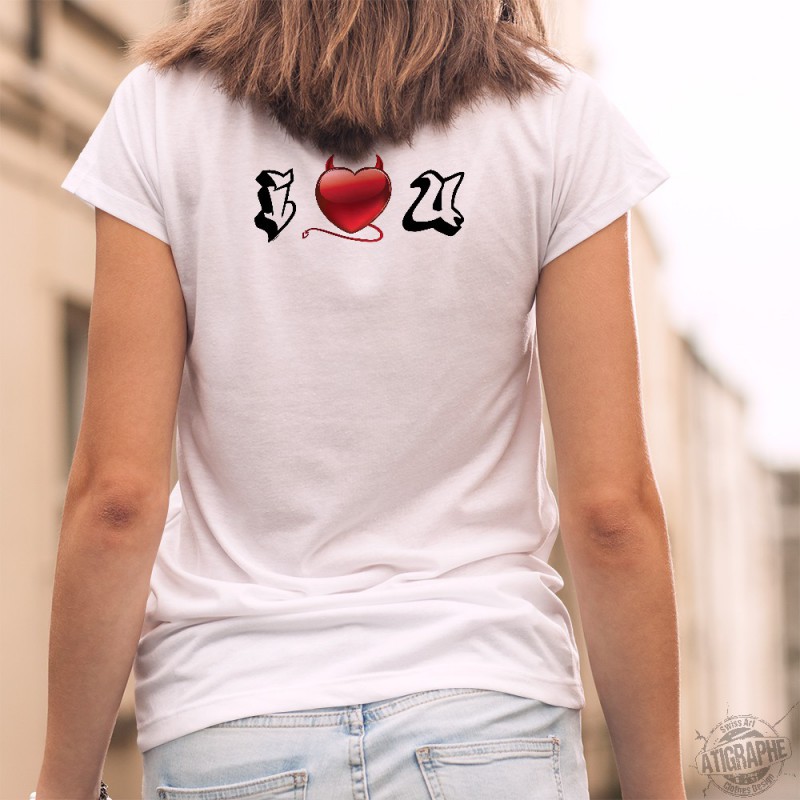 T-Shirt in einem sehr femininen Schnitt mit einem verlockenden kleinen Dämonenherz für das Wort LOVE und den Rest des Textes in Form von Graffiti