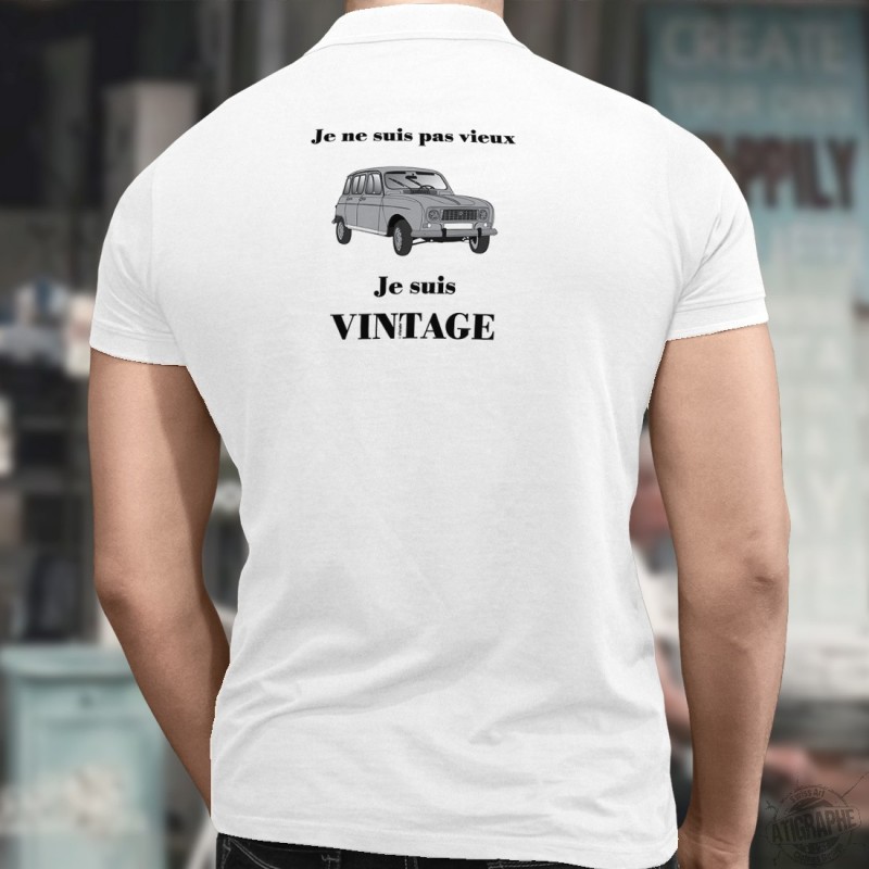 Herren Mode Polo shirt mit der lustiger Zitat " Je ne suis pas vieux, je suis vintage " und ein Vintage Renault 4L