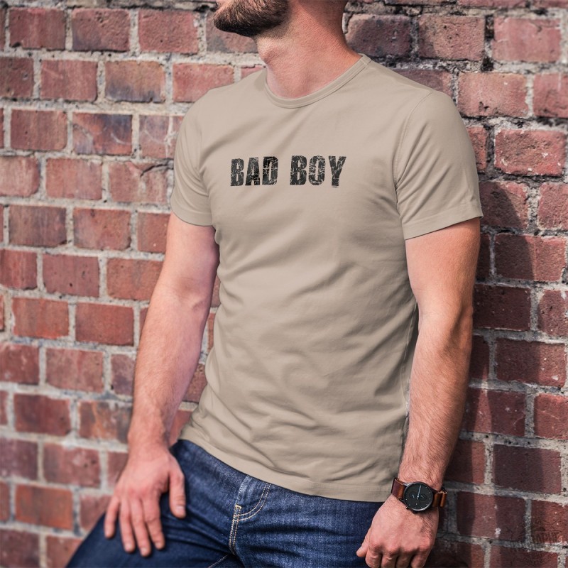 T-Shirt mit dem Slogan "Bad Boy" (böser Junge, zerkratzte Schrift) illustriert.