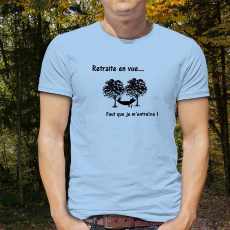 Modemann-T-Shirt veranschaulicht mit einem Mann, der in einer Hängematte hängenden hängen zwischen zwei Bäumen und dem französischen Zitat "Retraite en vue, faut que je m'entraîne!"