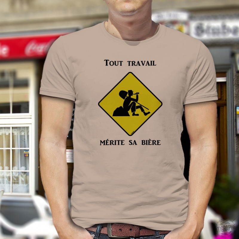 T-Shirt für Männer mit der französisch Zitat " Tout travail mérite sa bière" illustriert