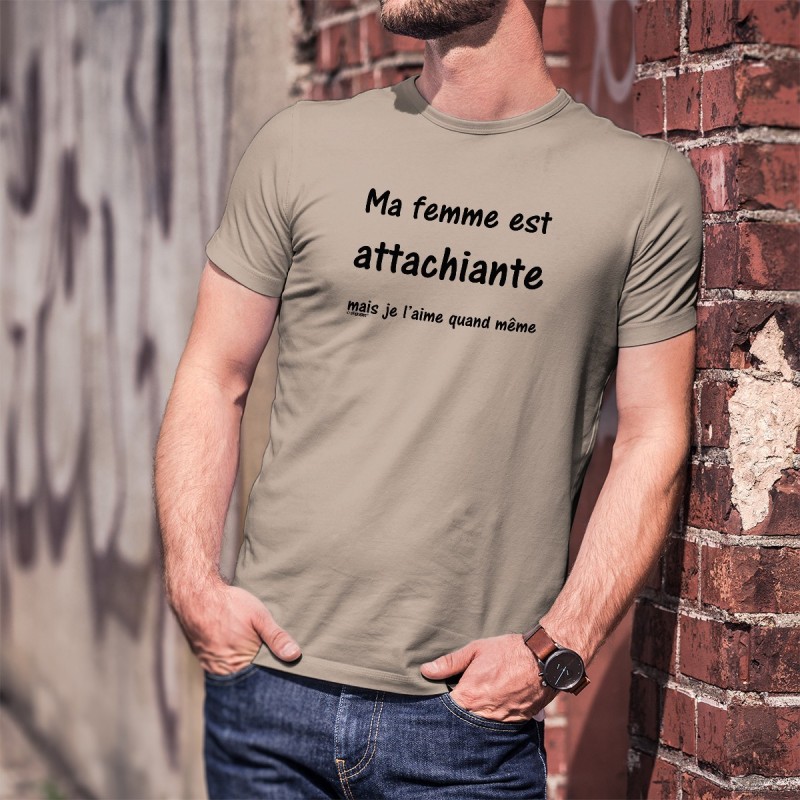 T-Shirt für Männer mit der französisch Zitat " Ma femme est attachiante" illustriert