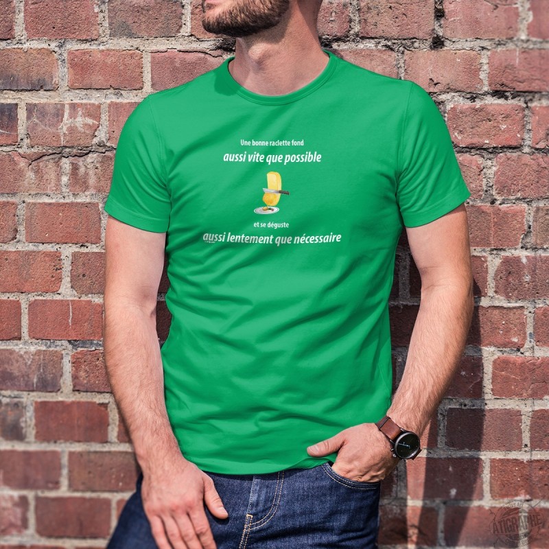 T-Shirt aus 100% Baumwolle illustriert mit einem Emblem mit der Erwähnung ✚ Une raclette ✚ Aussi vite que possible ✚