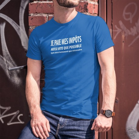 T-Shirt aus 100% Baumwolle illustriert mit einem Emblem mit der Erwähnung ✚ Je paie mes IMPÔTS ✚ Aussi vite que possible ✚