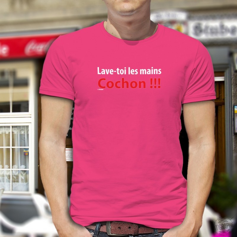 Baumwoll-T-Shirt illustriert mit "Lave-toi les mains ★ Cochon !!! ★