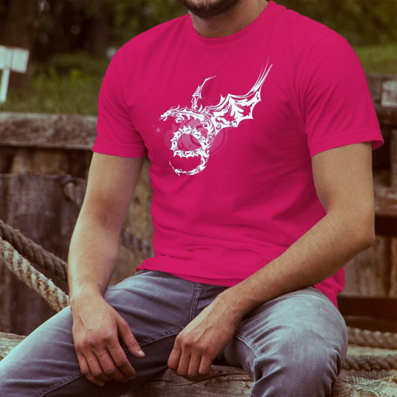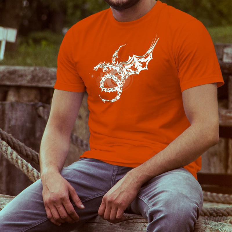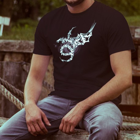 T-Shirt aus 100% Baumwolle mit einem geflügelten Stammesdrachen in einer herausfordernden Pose vor einer Reihe konzentrischer Kreise, die die Umlaufbahn von Planeten und Sternen im Universum darstellen