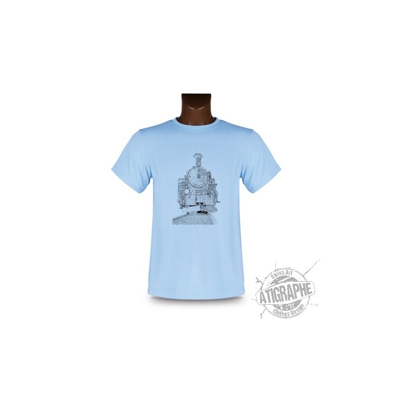 Dieses T-Shirt ist mit einer Dampflokomotive, illustriert.