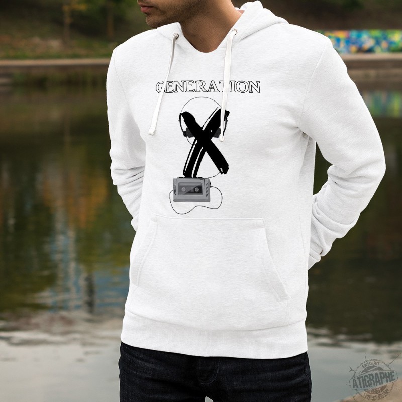 Kapuzen-Sweatshirt mit dem Ausdruck ☀ Generation X ☀ und einem Walkman Audiokassette, Kultobjekt der späten siebziger Jahre