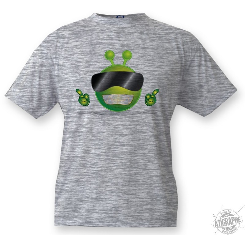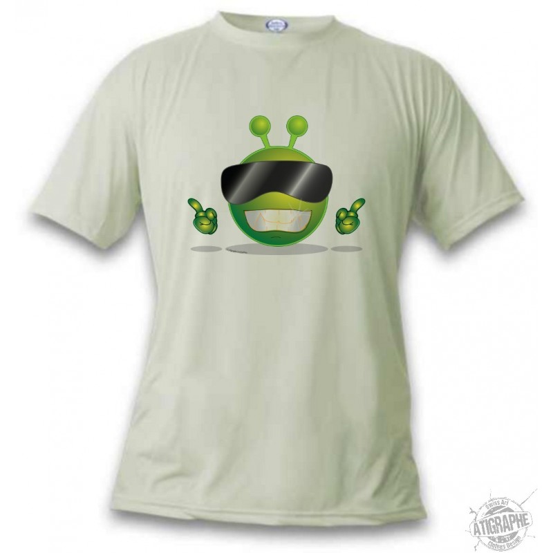 T-Shirt für Mann oder Frau, mit einem Sonnenbrillen entspannten Alien smiley illustriert.