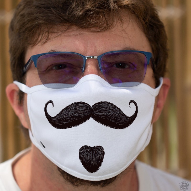 Humorvolle Maske aus zweilagigem Stoff, waschbar, illustriert mit dem Design im Vintage-Hipster-Stil eines Schnurrbartes und eines Spitzbartes