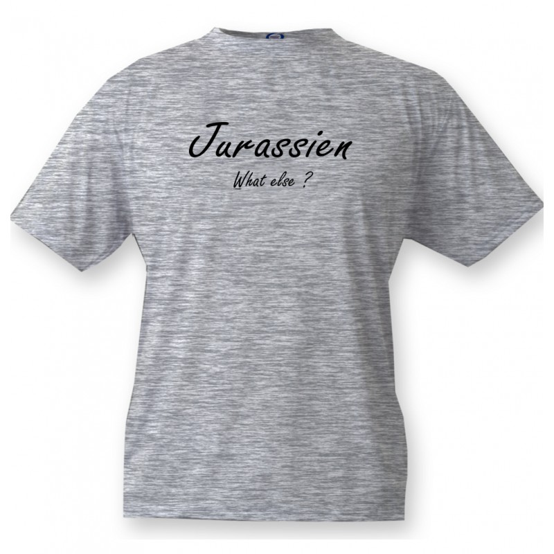 Humoristisch T-Shirt für Kinder mit französisch Zitat "Jurassien, What else ?", Eine Abschweifung des Slogans von George Clooney für eine berühmte Kaffeemarke.