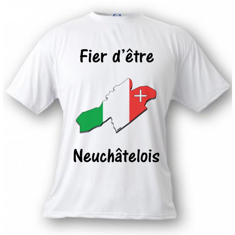 Kinder T-Shirt mit der Neuenburger Grenzen in 3D und dem Slogan "Fier d'être Neuchâtelois" illustriert