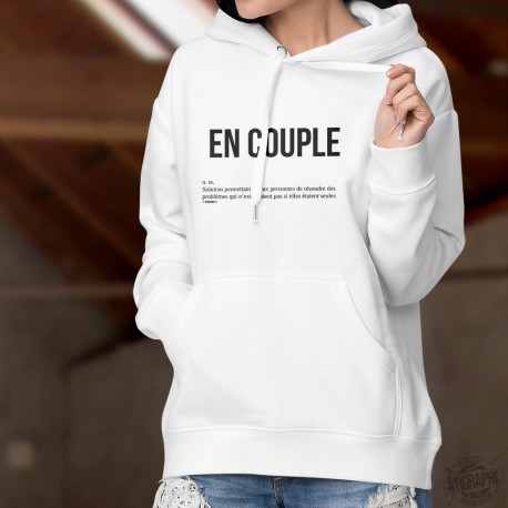 Frauen Kapuzensweatshirt, illustriert mit der "EN COUPLE" französisch Zitat