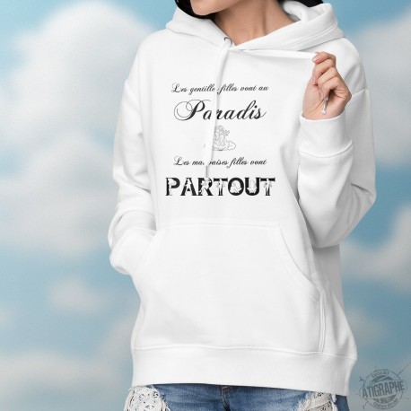Fruaen lustiges Kapuzenpullover illustriert mit humorvollen Zitat "Les gentilles filles vont au Paradis ★"