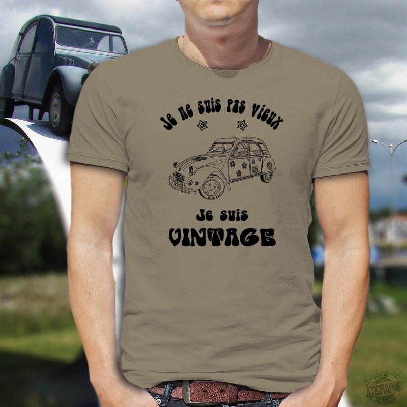 Humoristische T-shirt mit einem Citroen Deux Chevaux geschmückt mit Hippies Blumen und das humorvolle Zitat " Je ne suis pas vieux, je suis vintage " illustriert. Französisch Version