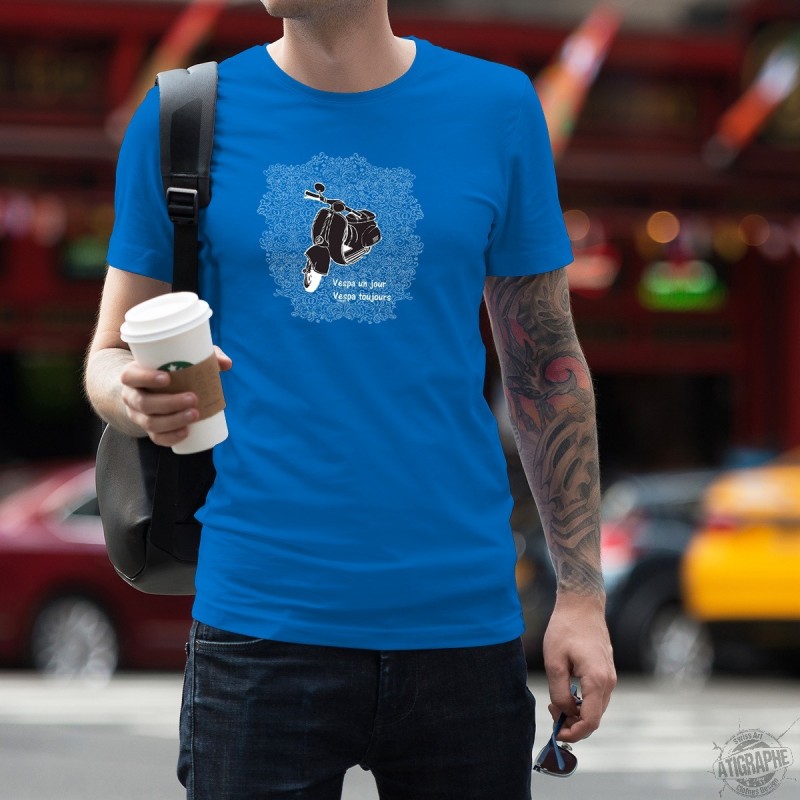 T-Shirt aus 100% Baumwolle, illustriert von dem Zitat "Vespa un jour, Vespa toujours"