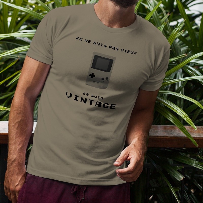Humoristische T-shirt mit dem Slogan " Je ne suis pas vieux, je suis vintage " und Die Berühmte Gameboy illustriert. Französisch Version