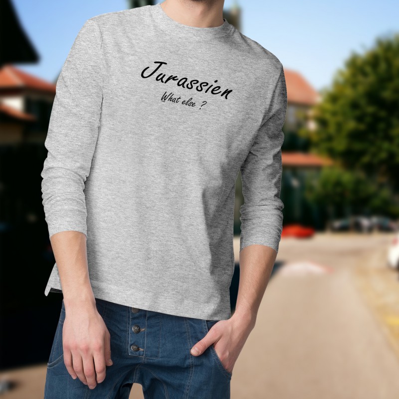 Männer-Sweatshirt, illustriert mit dem Zitat "Jurassien, What else ?", Eine Abschweifung der berühmten Phrase von George Clooney in den Anzeigen für die Kaffee-Marke