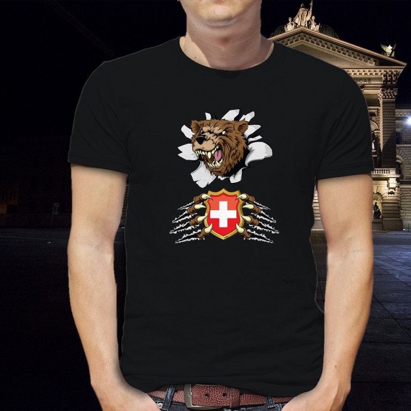 T-Shirt aus 100% Baumwolle mit dem Kopf eines knurrenden Bären, der das T-Shirt zerreißt und das Wappen der Schweiz zwischen den Krallen hält