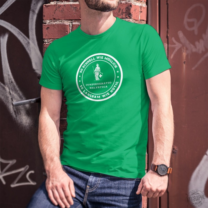 T-Shirt aus 100% Baumwolle illustriert mit einem Emblem mit der Erwähnung ✚ So schnell wie möglich, so langsam wie nötig ✚ und einer Darstellung von ★ Frau Helvetia ★